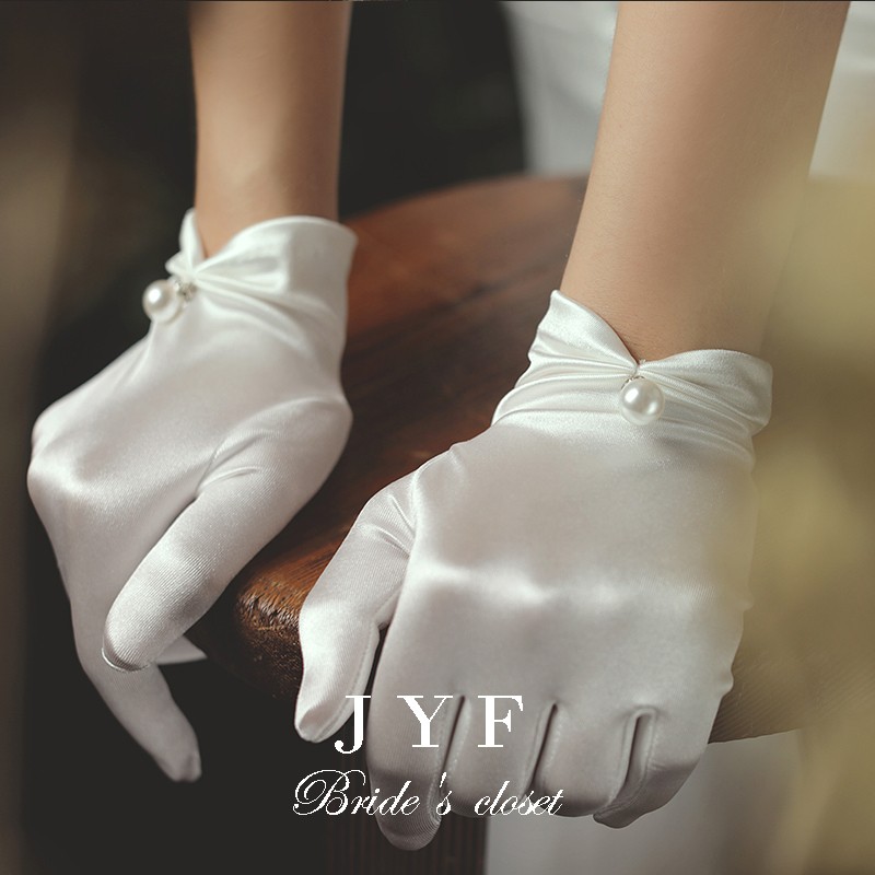 珠宝道具白色缎珍珠手套婚纱简约短款礼服摄影手套面柔新娘拍照纱热门设计联盟服务商