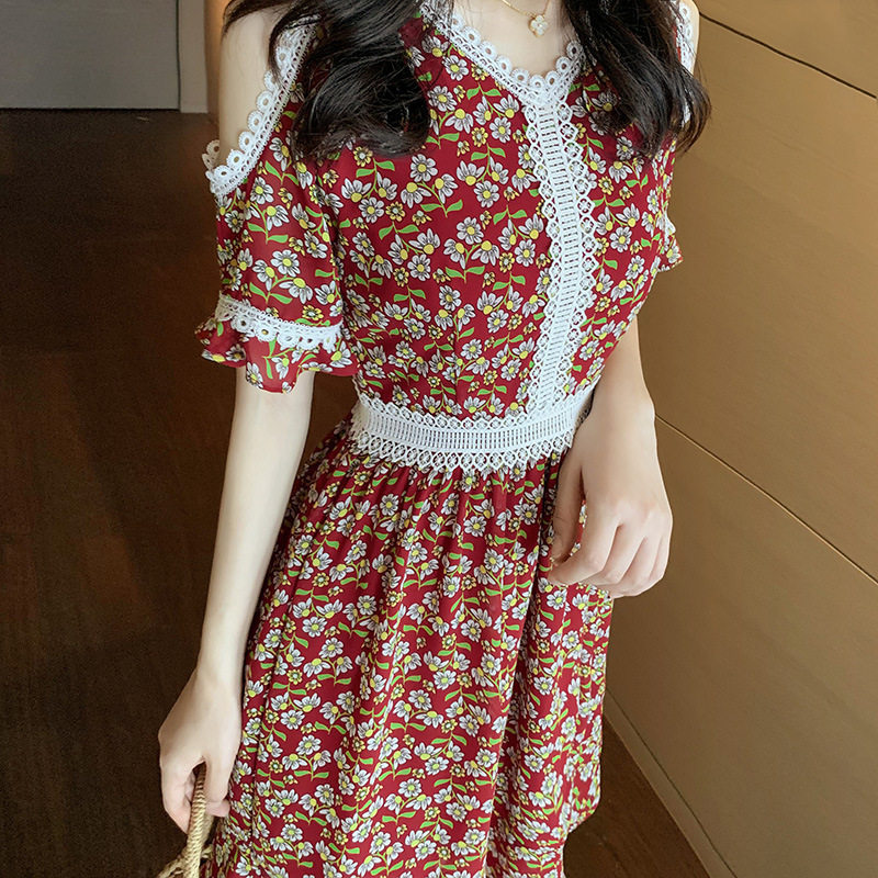 坚果服饰炸街碎花裙子2021夏季新款设计感露肩V领收腰显瘦连衣裙热门设计联盟服务商