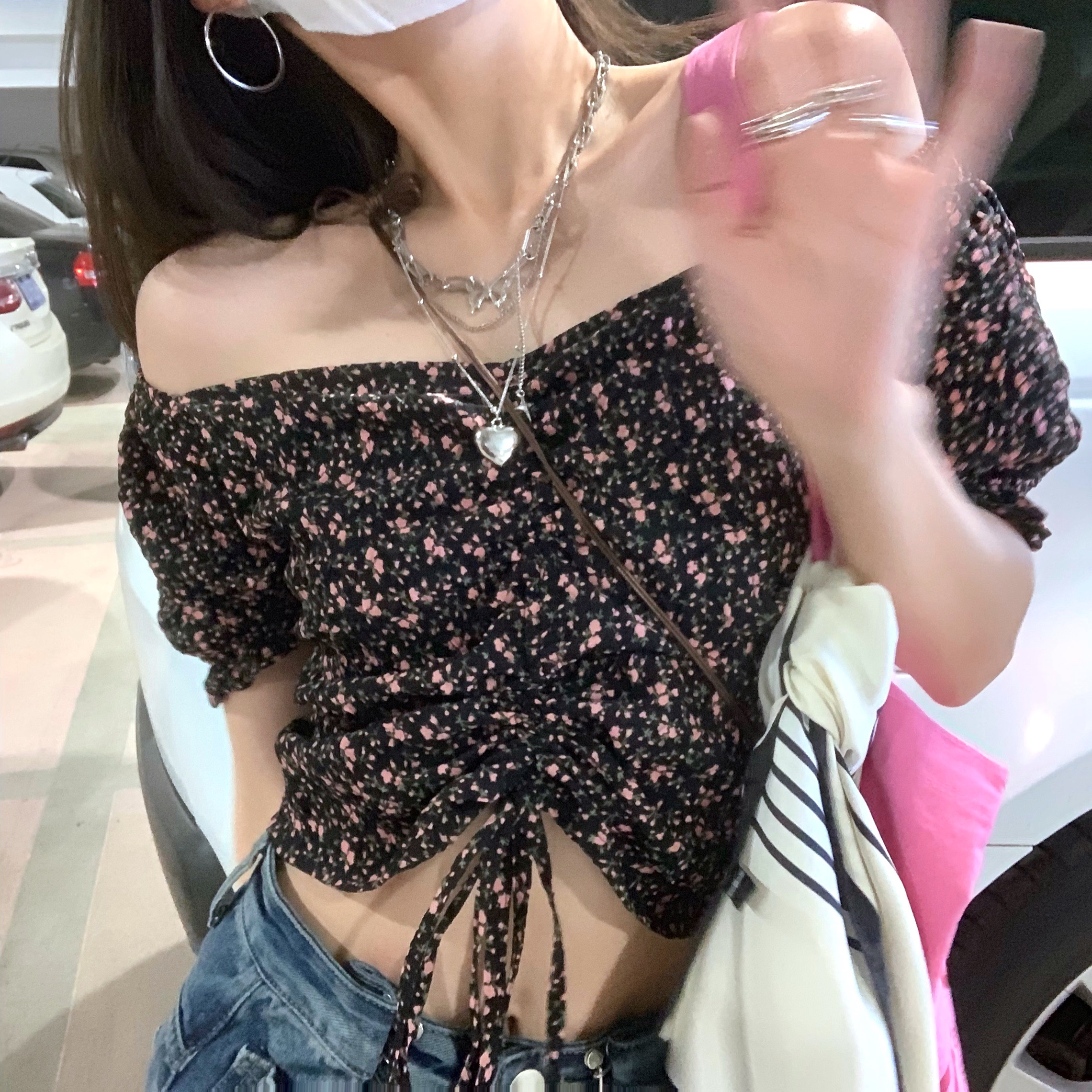 甜辣风碎花一字肩上衣女露锁骨设计感小众夏季百搭短款抽绳上衣热门设计联盟服务商