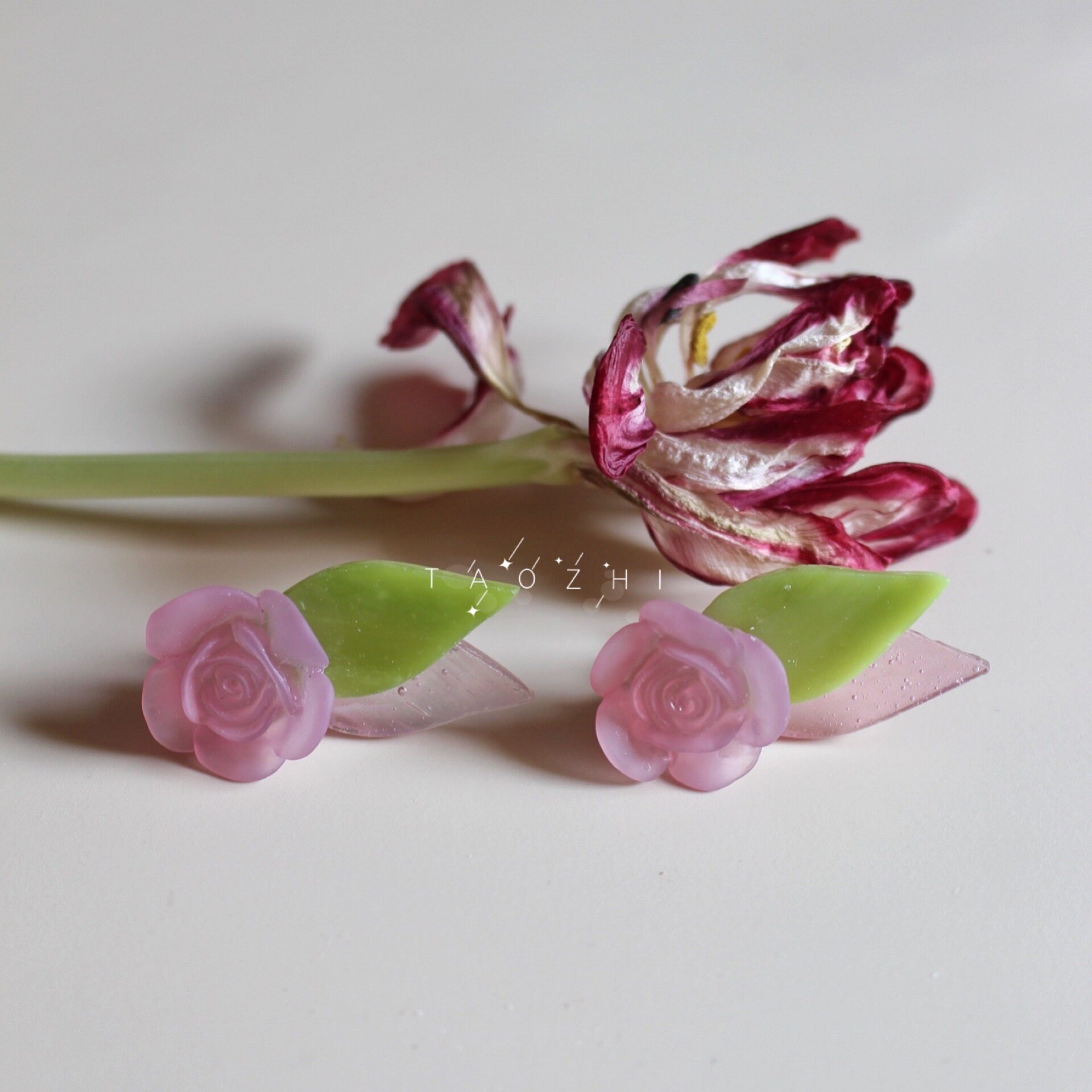 桃之原创设计 薄雾玫瑰 树脂琉璃温柔甜美耳钉百搭简约气质耳饰热门设计联盟服务商